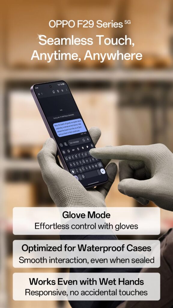 Glove Mode 🧤 – Effortlessly operate OPPO F29 5G even while wearing gloves in cold weather or any situation. ✅ Optimized for Waterproof Cases 🌊 – Enjoy smooth touchscreen interaction even when the phone is inside a waterproof case. ✅ Perfect Touch with Wet Hands 💦 – The phone remains responsive even with wet hands, ensuring no accidental touches.
